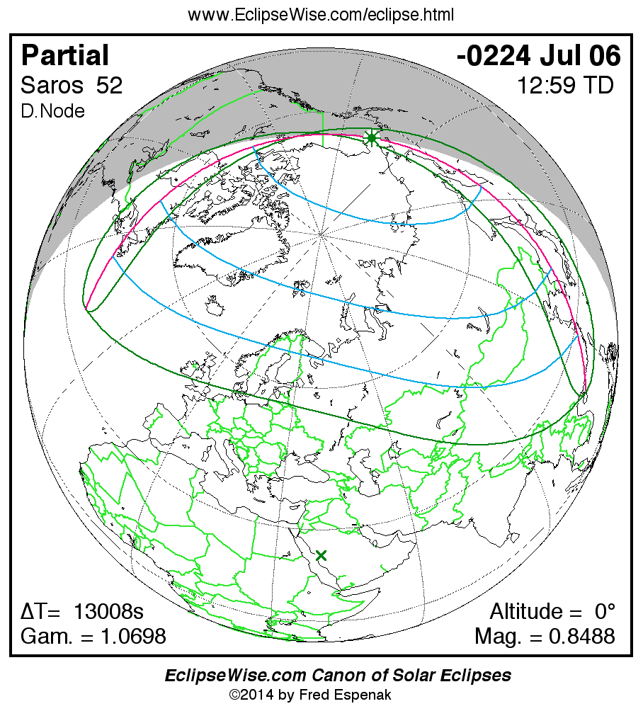 The instant of greatest eclipse takes place on -0224 Jul 06 at 12:58:58 TD (09:22:12 UT1).