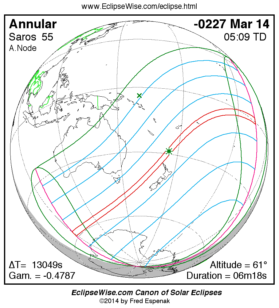 - Path Table: Annular Solar Eclipse of -0227 Mar 14 - coordinates of the central line and path limits