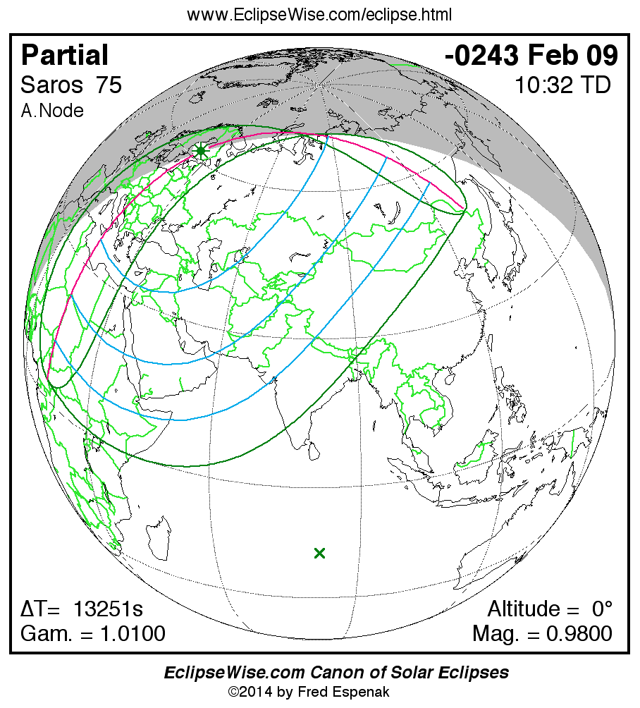 The instant of greatest eclipse takes place on -0243 Feb 09 at 10:32:26 TD (06:51:37 UT1).