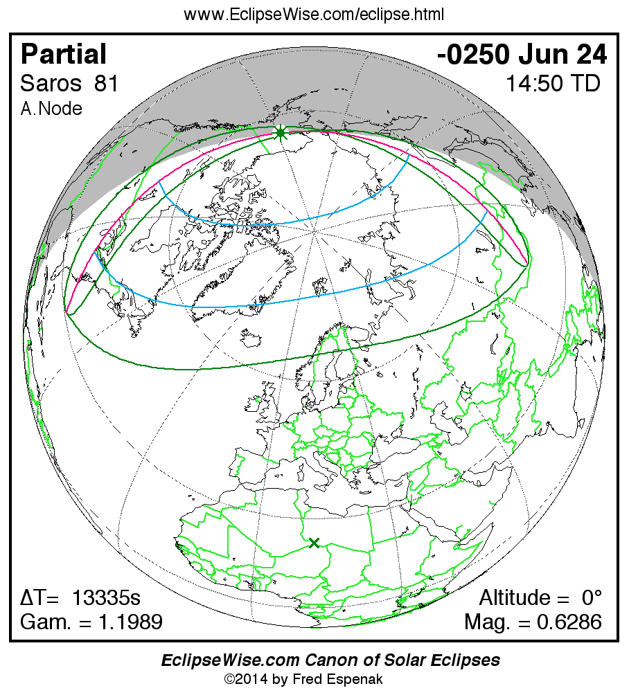 The instant of greatest eclipse takes place on -0250 Jun 24 at 14:50:25 TD (11:08:12 UT1).