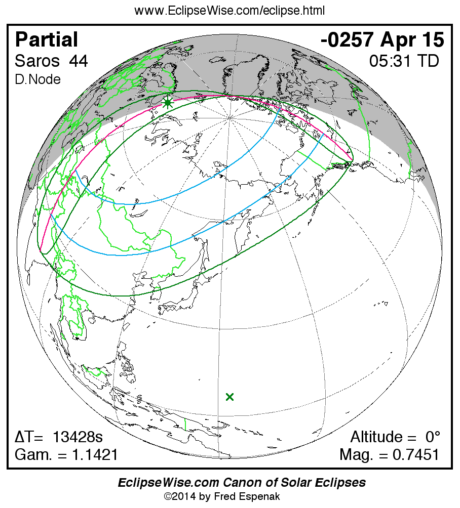 The instant of greatest eclipse takes place on -0257 Apr 15 at 05:31:07 TD (01:47:21 UT1).
