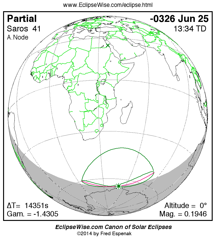 The instant of greatest eclipse takes place on -0326 Jun 25 at 13:34:15 TD (09:35:06 UT1).