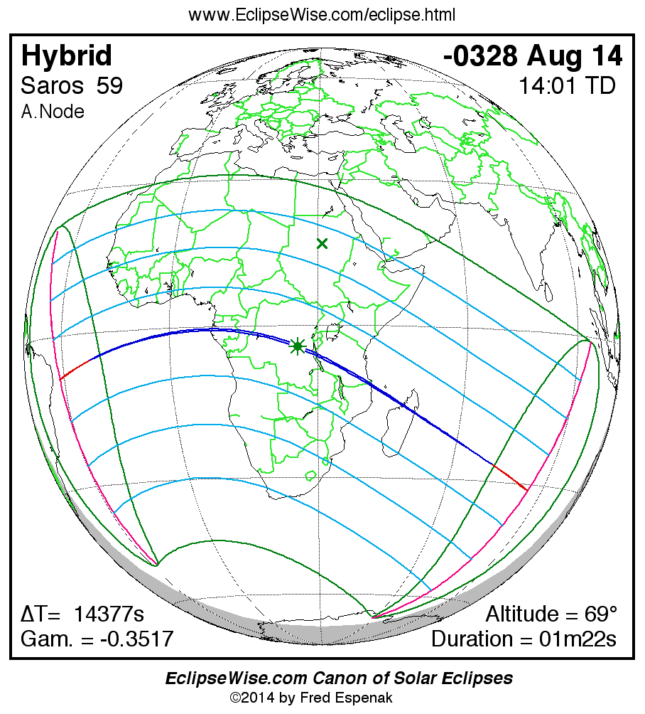 - Google Map: Hybrid Solar Eclipse of -0328 Aug 14 - interactive map of the eclipse path
