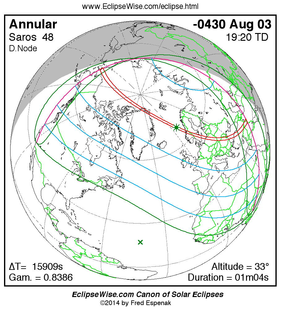 The instant of greatest eclipse takes place on -0430 Aug 03 at 19:19:46 TD (14:54:40 UT1).