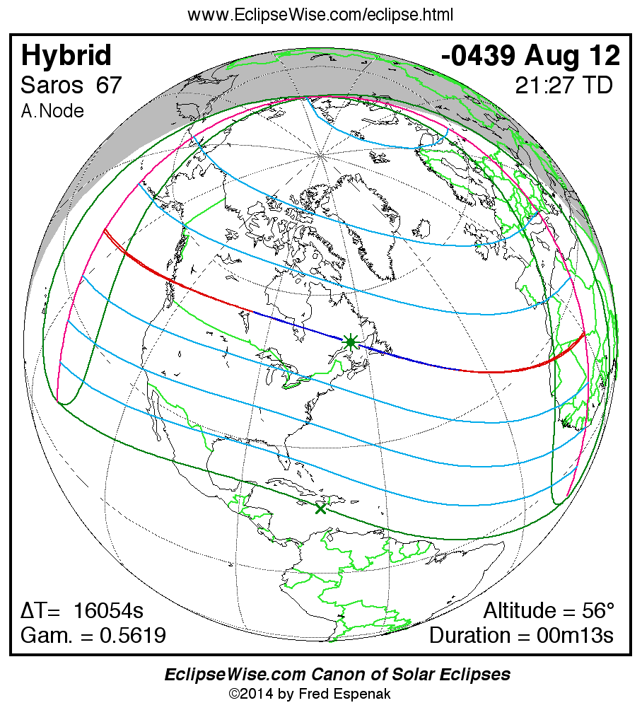 The solar eclipse of -0439 Aug 12 is one of the rare hybrid solar eclipses. In this particular case the eclipse path starts out as annular. Further down the track it changes to total and then back to annular before the path ends. It is a very short hybrid eclipse with a duration at greatest eclipse of 00m13s. The eclipse magnitude is 1.0026, while Gamma has a value of 0.5619.