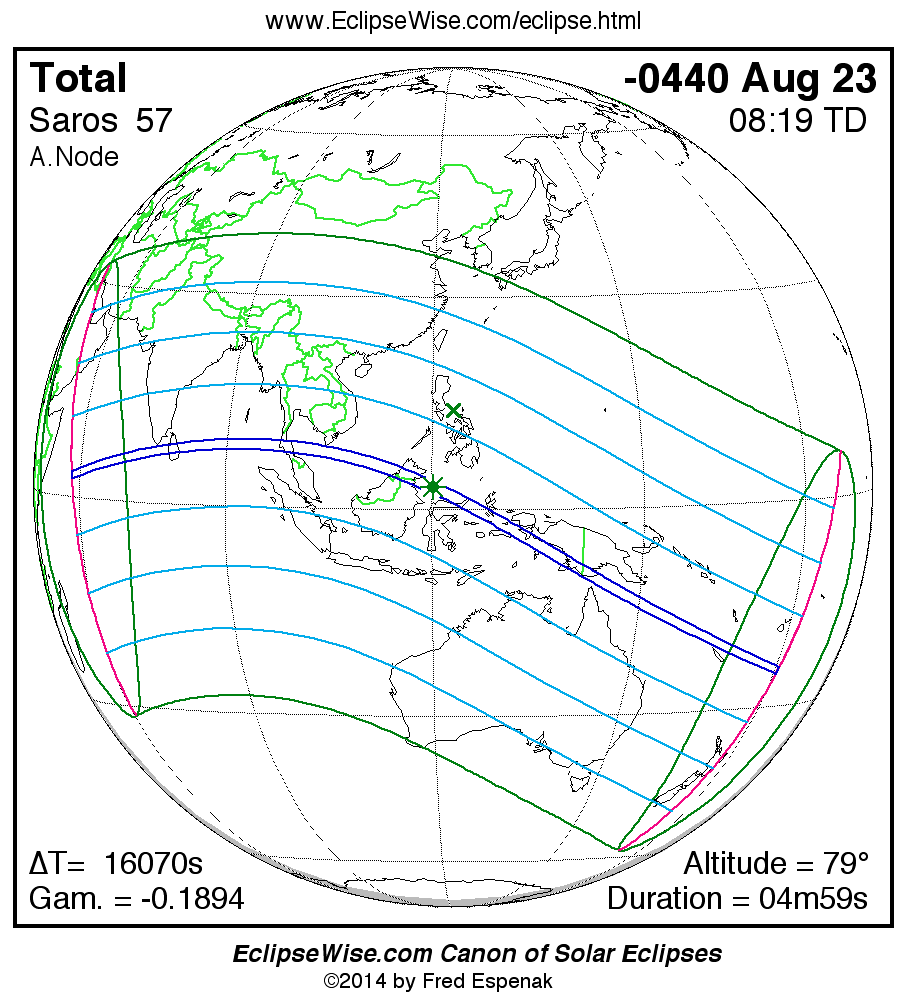 - Circumstances Table: Total Solar Eclipse of -0440 Aug 23 - eclipse times for hundreds of cities