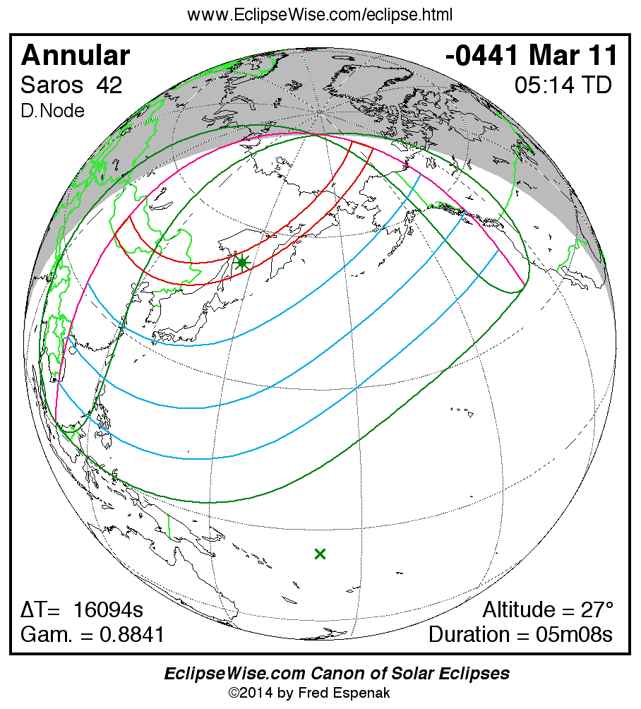 The instant of greatest eclipse takes place on -0441 Mar 11 at 05:14:03 TD (00:45:51 UT1).