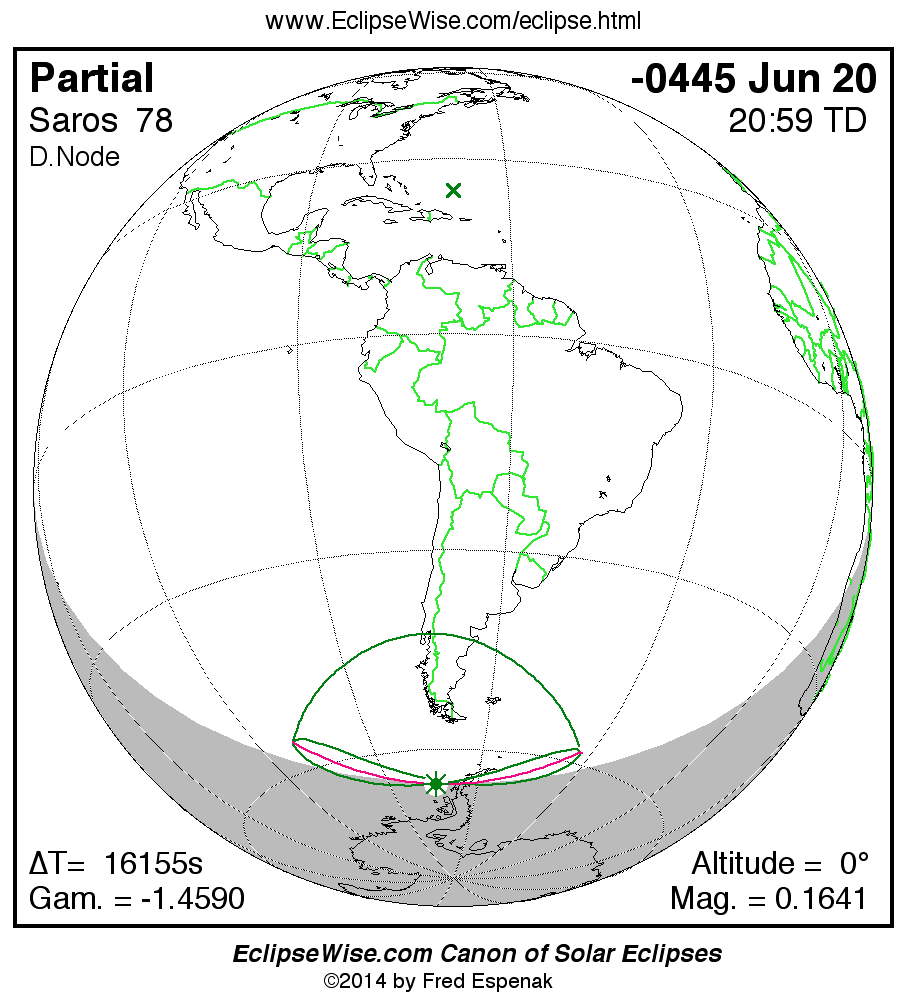 The instant of greatest eclipse takes place on -0445 Jun 20 at 20:59:27 TD (16:30:14 UT1).