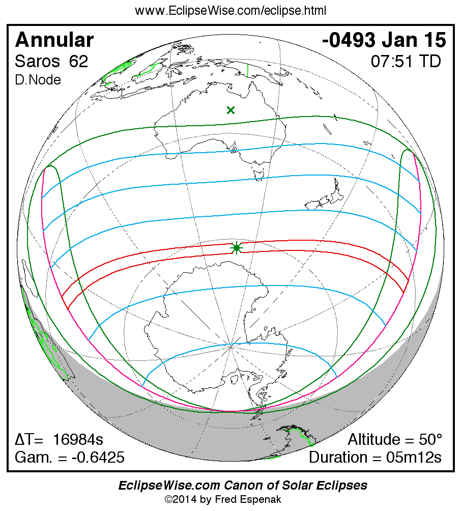 The instant of greatest eclipse takes place on -0493 Jan 15 at 07:50:44 TD (03:07:42 UT1).