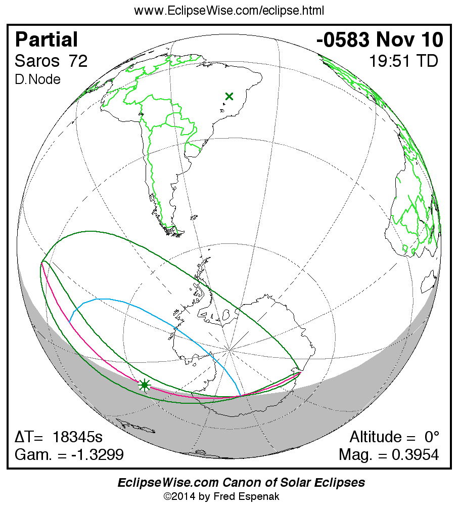 The instant of greatest eclipse takes place on -0583 Nov 10 at 19:51:24 TD (14:45:41 UT1).