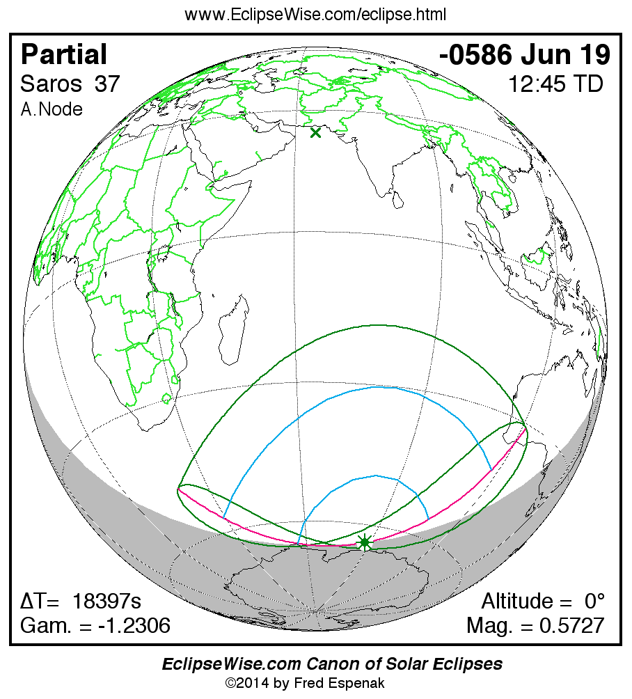 The instant of greatest eclipse takes place on -0586 Jun 19 at 12:44:42 TD (07:38:08 UT1).