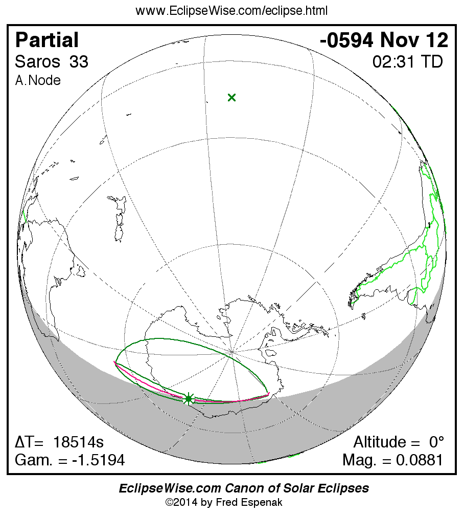 The instant of greatest eclipse takes place on -0594 Nov 13 at 02:30:39 TD (21:22:08 UT1).