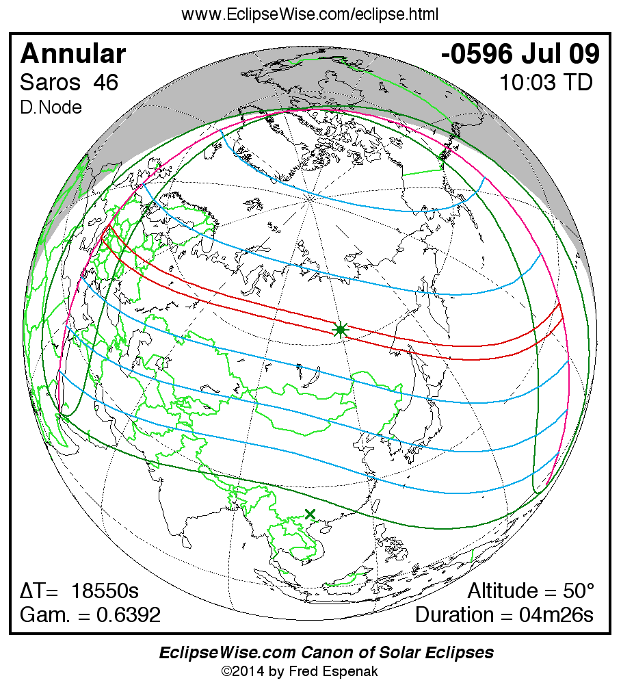 The instant of greatest eclipse takes place on -0596 Jul 09 at 10:02:32 TD (04:53:25 UT1).