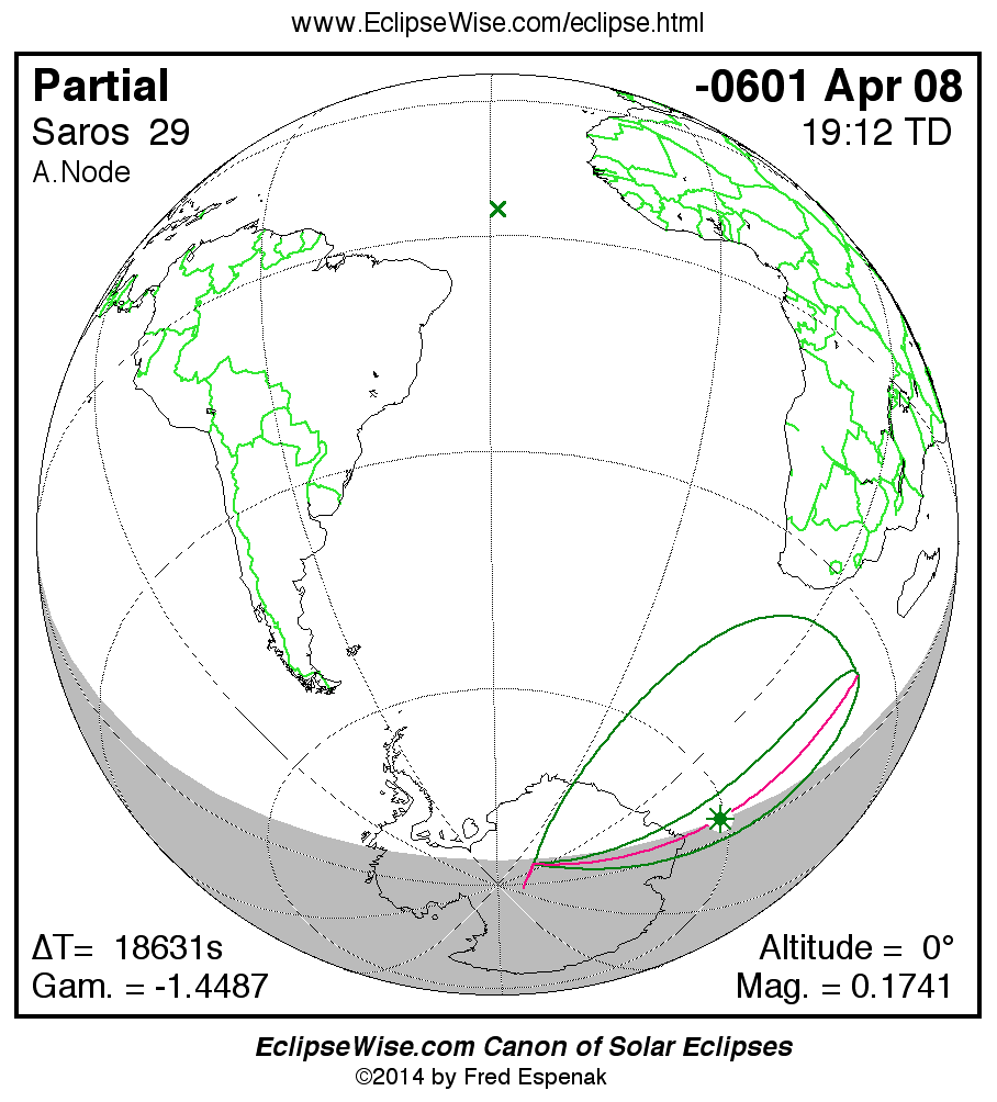 The instant of greatest eclipse takes place on -0601 Apr 08 at 19:11:39 TD (14:01:11 UT1).