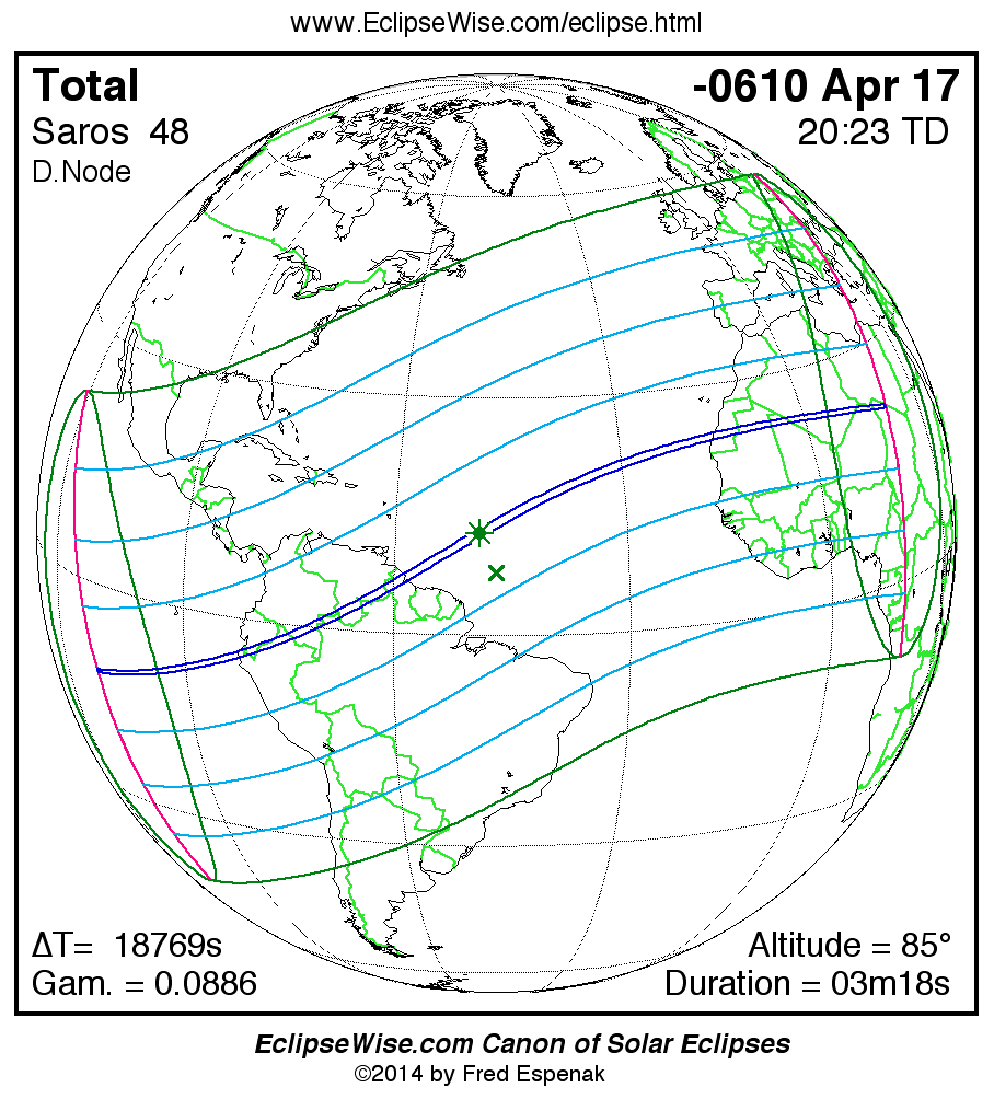The instant of greatest eclipse takes place on -0610 Apr 17 at 20:22:40 TD (15:09:53 UT1).