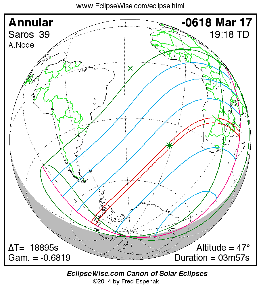 The instant of greatest eclipse takes place on -0618 Mar 17 at 19:17:37 TD (14:02:45 UT1).