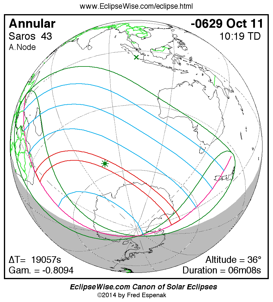 - Orthographic Map: Annular Solar Eclipse of -0629 Oct 11 - global map of eclipse visibility
