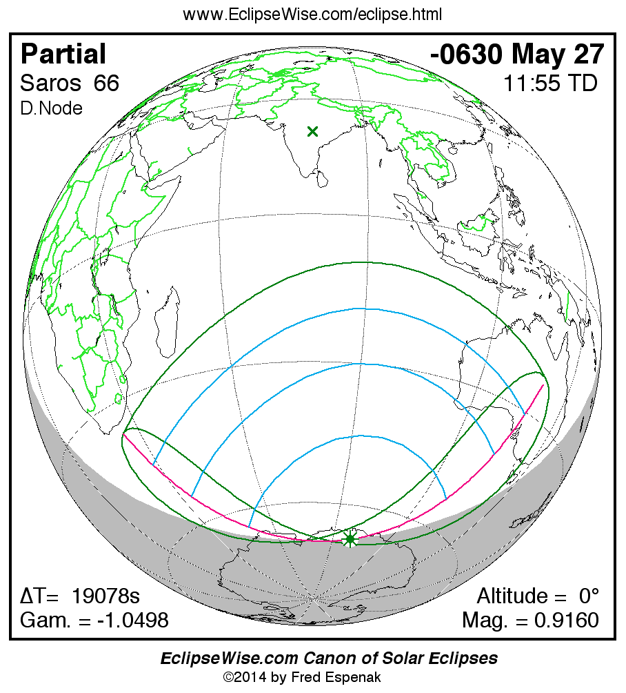The instant of greatest eclipse takes place on -0630 May 27 at 11:54:46 TD (06:36:50 UT1).