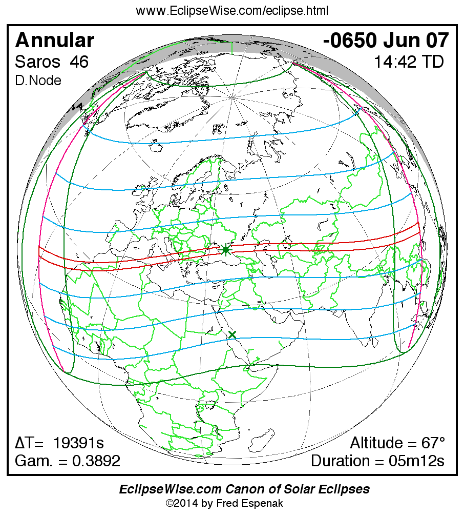 The instant of greatest eclipse takes place on -0650 Jun 07 at 14:41:48 TD (09:18:39 UT1).