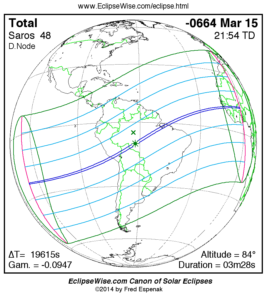 The instant of greatest eclipse takes place on -0664 Mar 15 at 21:54:10 TD (16:27:17 UT1).