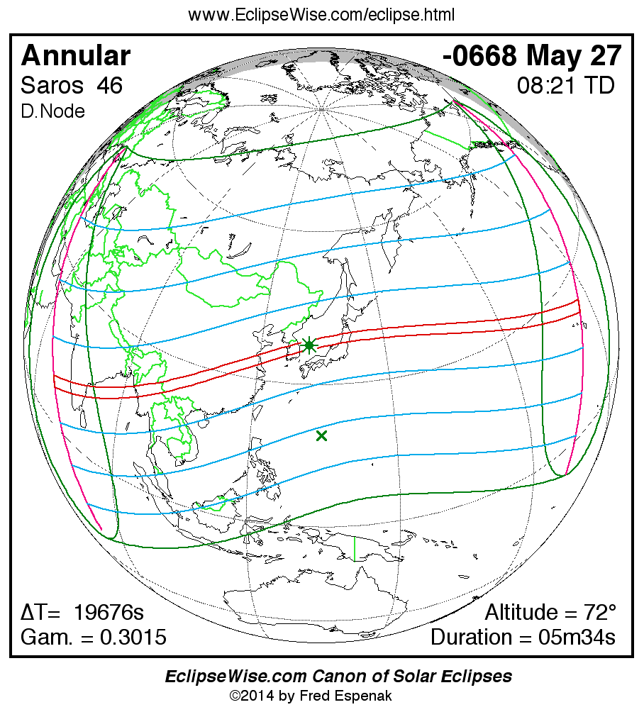 - Path Table: Annular Solar Eclipse of -0668 May 27 - coordinates of the central line and path limits
