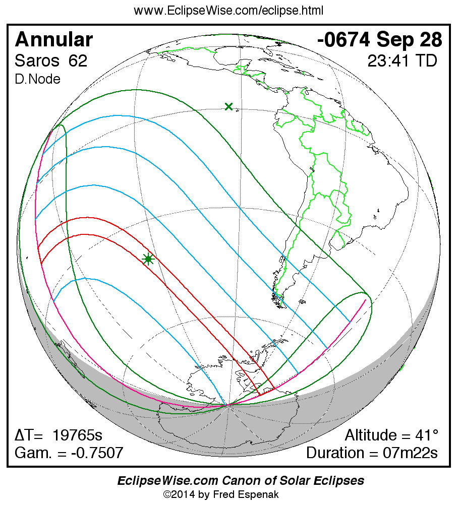 - Orthographic Map: Annular Solar Eclipse of -0674 Sep 28 - global map of eclipse visibility