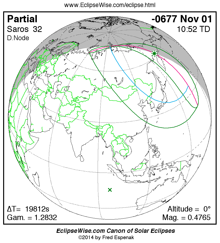 The instant of greatest eclipse takes place on -0677 Nov 01 at 10:51:59 TD (05:21:50 UT1).
