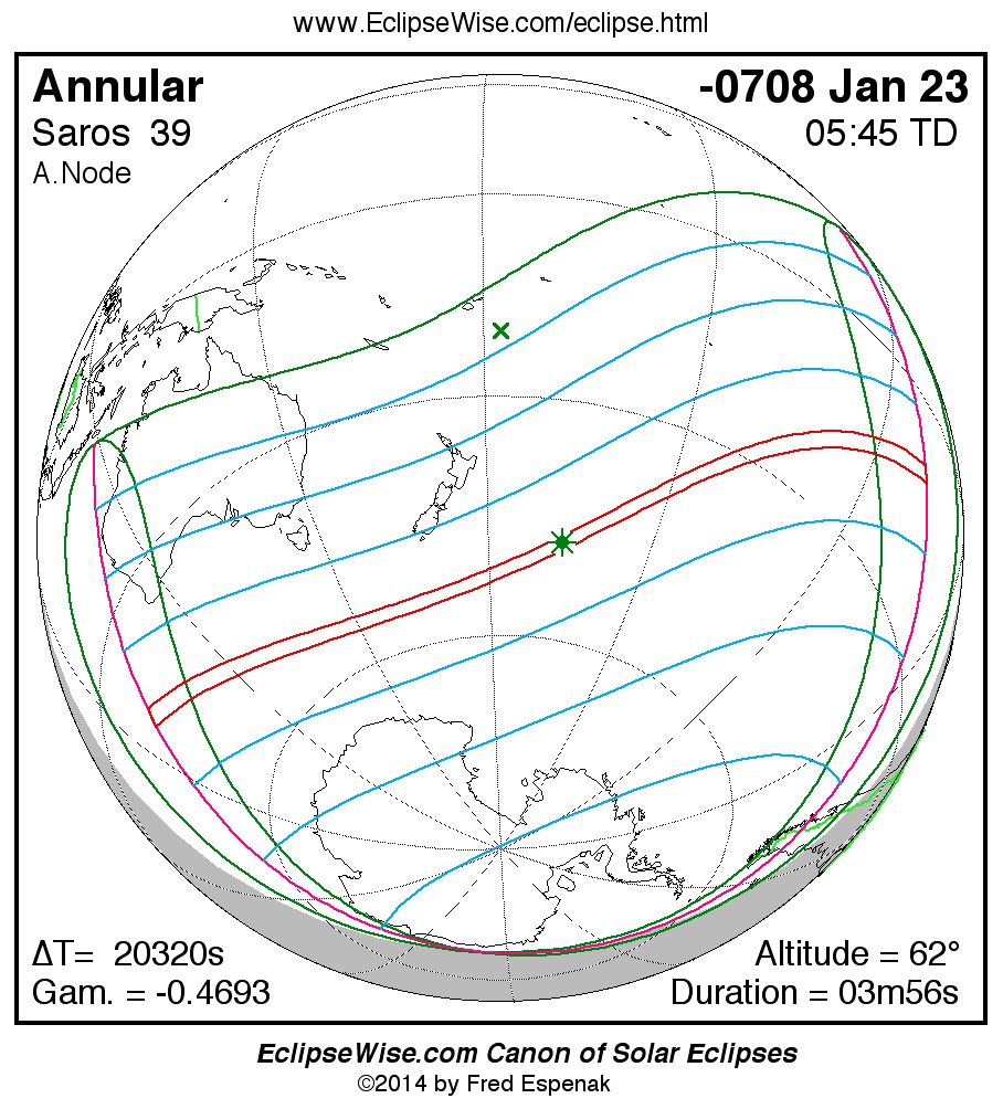 Annular Solar Eclipse of -0708 Jan 23 (0709 Jan 23 BCE)