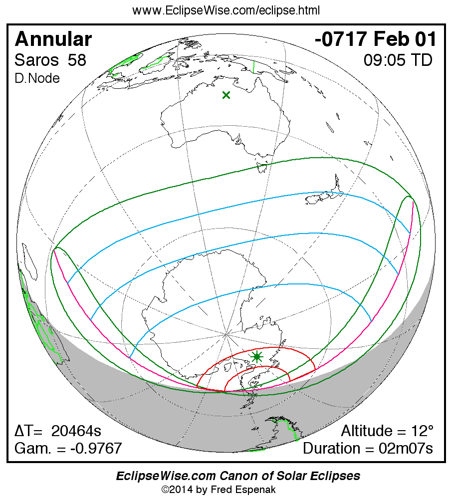 The instant of greatest eclipse takes place on -0717 Feb 01 at 09:05:30 TD (03:24:29 UT1).