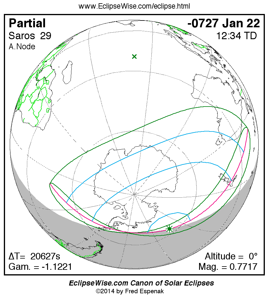 The instant of greatest eclipse takes place on -0727 Jan 22 at 12:34:24 TD (06:50:40 UT1).