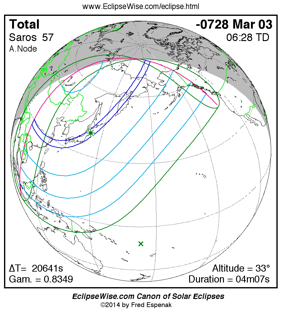 - Orthographic Map: Total Solar Eclipse of -0728 Mar 03 - global map of eclipse visibility