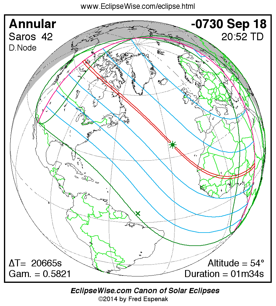 The instant of greatest eclipse takes place on -0730 Sep 18 at 20:51:38 TD (15:07:16 UT1).