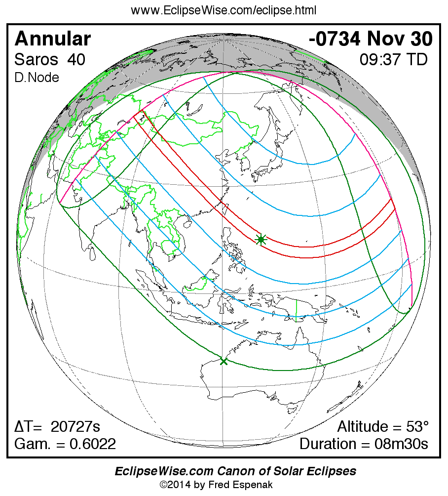 - Path Table: Annular Solar Eclipse of -0734 Nov 30 - coordinates of the central line and path limits
