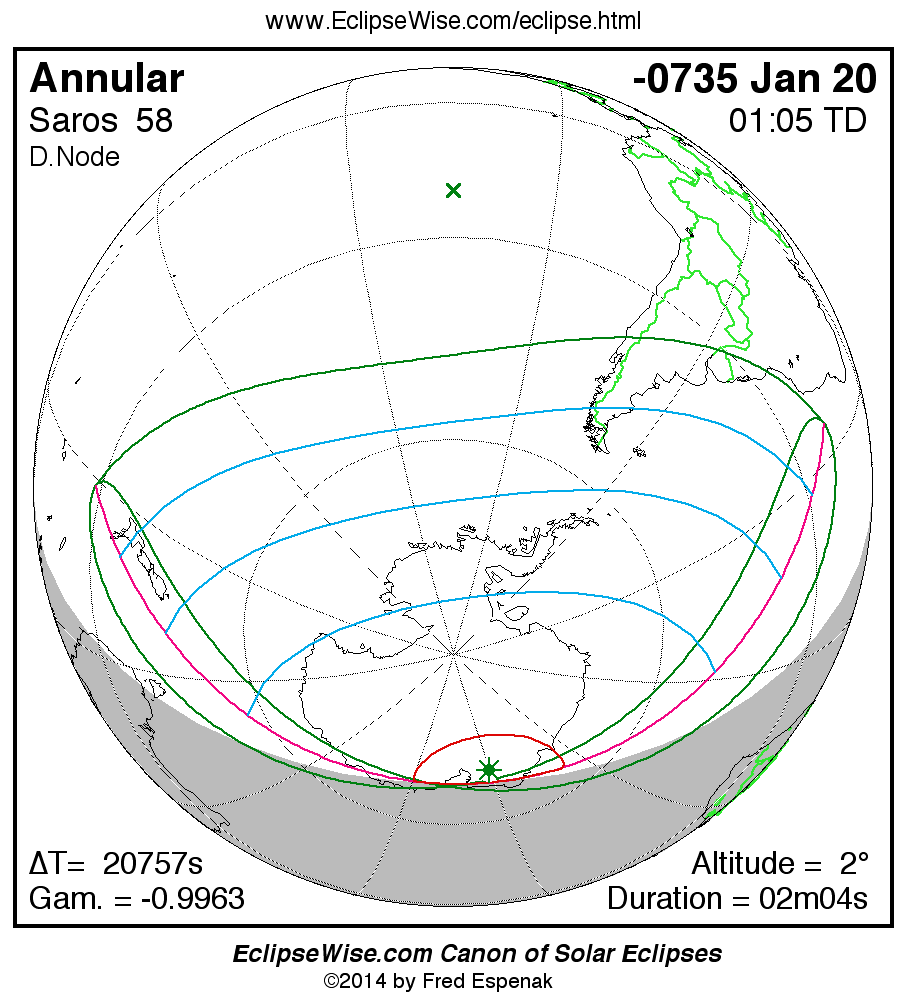 - Orthographic Map: Annular Solar Eclipse of -0735 Jan 21 - global map of eclipse visibility