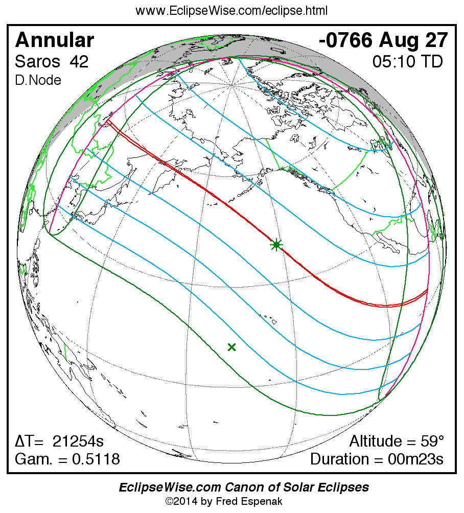 - Path Table: Annular Solar Eclipse of -0766 Aug 28 - coordinates of the central line and path limits