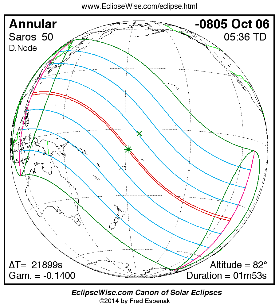 The instant of greatest eclipse takes place on -0805 Oct 07 at 05:35:51 TD (23:30:54 UT1).