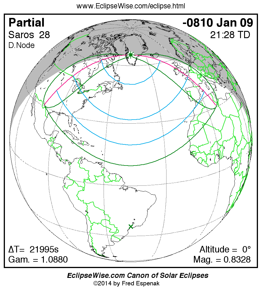 The instant of greatest eclipse takes place on -0810 Jan 09 at 21:28:13 TD (15:21:40 UT1).
