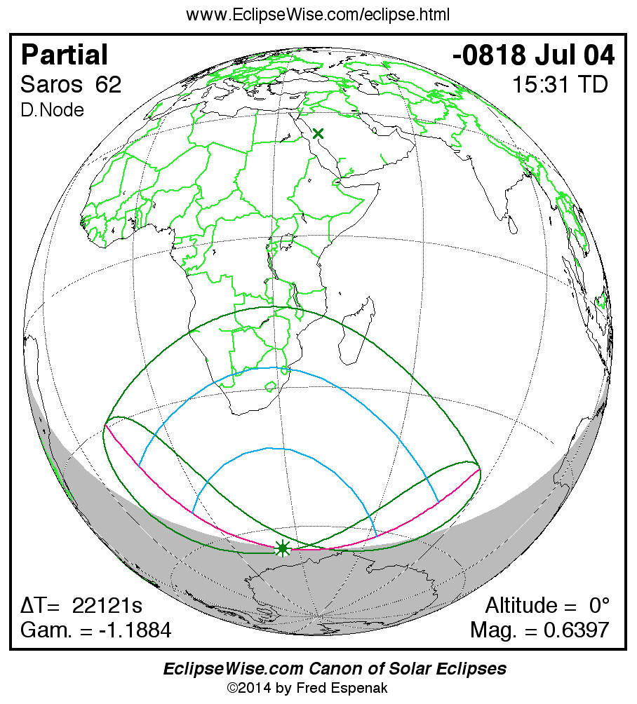 The instant of greatest eclipse takes place on -0818 Jul 04 at 15:30:52 TD (09:22:13 UT1).