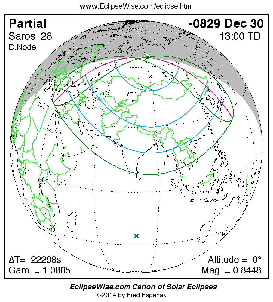 The instant of greatest eclipse takes place on -0829 Dec 30 at 12:59:46 TD (06:48:11 UT1).