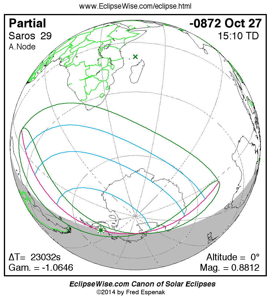 The instant of greatest eclipse takes place on -0872 Oct 27 at 15:09:48 TD (08:45:59 UT1).