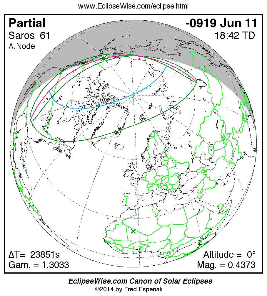 The instant of greatest eclipse takes place on -0919 Jun 11 at 18:42:25 TD (12:04:57 UT1).