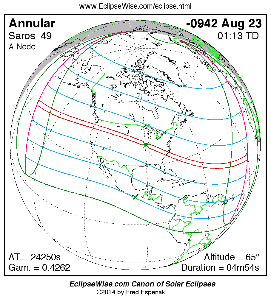 The instant of greatest eclipse takes place on -0942 Aug 24 at 01:13:18 TD (18:29:11 UT1).