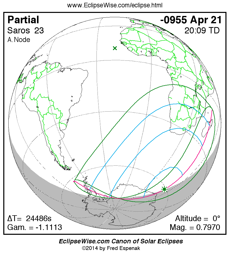 The instant of greatest eclipse takes place on -0955 Apr 21 at 20:08:56 TD (13:20:54 UT1).