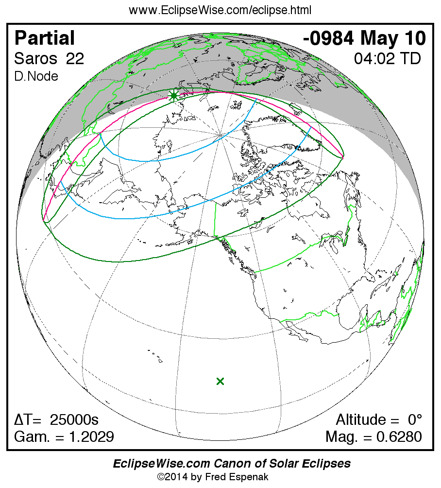 The instant of greatest eclipse takes place on -0984 May 11 at 04:02:08 TD (21:05:31 UT1).