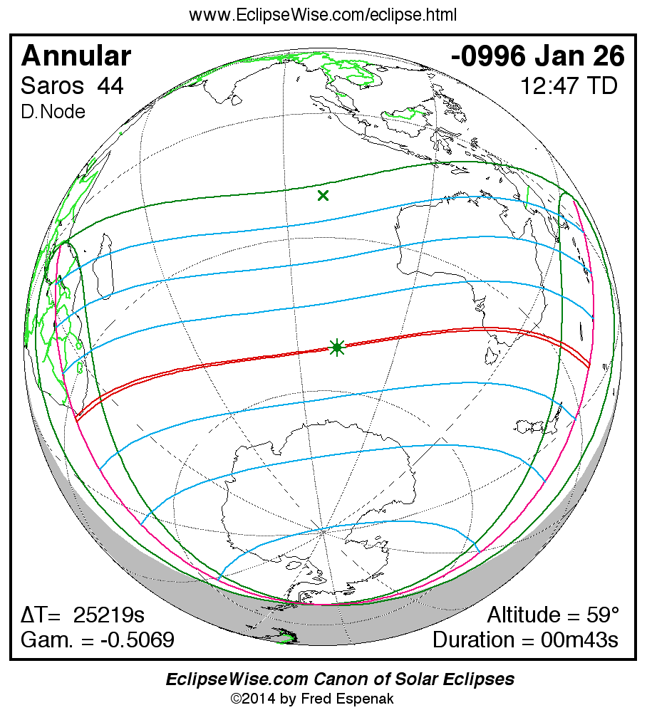 The instant of greatest eclipse takes place on -0996 Jan 26 at 12:47:01 TD (05:46:45 UT1).