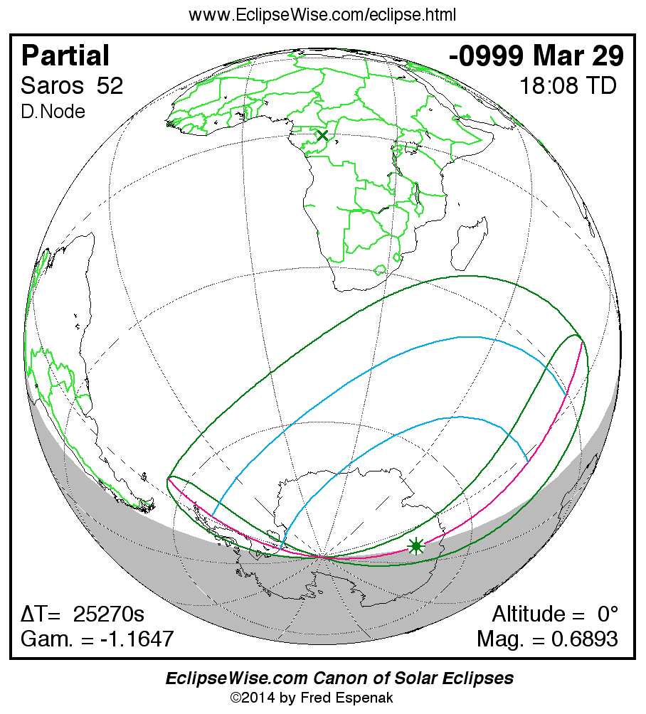 The instant of greatest eclipse takes place on -0999 Mar 29 at 18:08:26 TD (11:07:19 UT1).