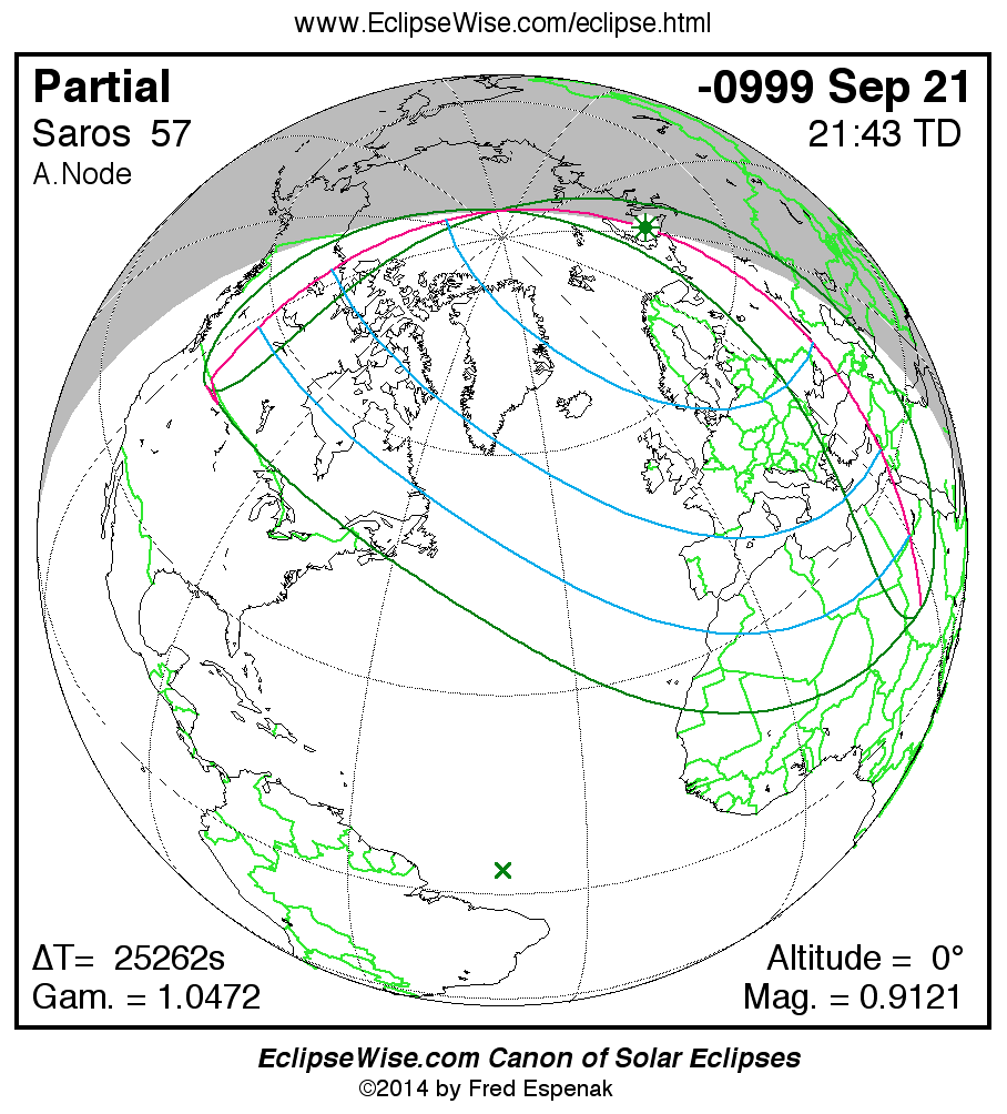 The instant of greatest eclipse takes place on -0999 Sep 21 at 21:42:47 TD (14:41:48 UT1).