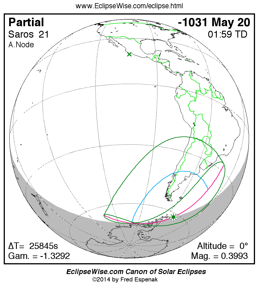 The instant of greatest eclipse takes place on -1031 May 21 at 01:58:59 TD (18:48:17 UT1).