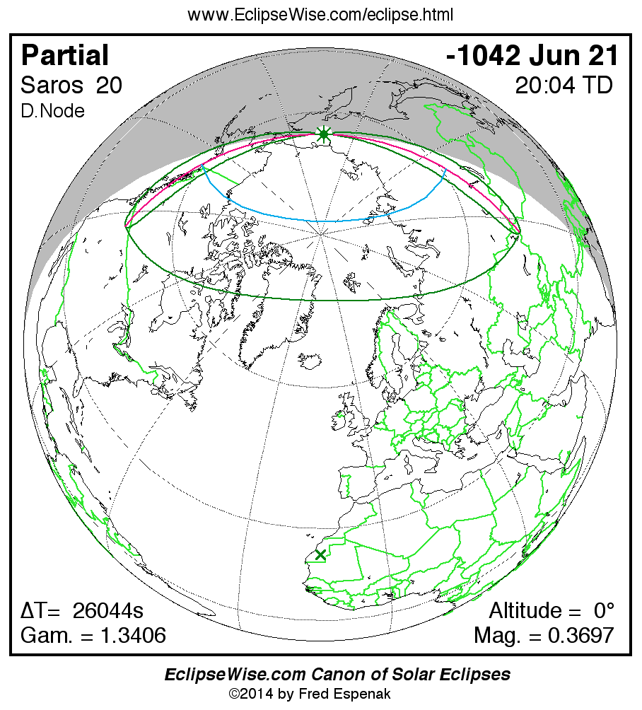 The instant of greatest eclipse takes place on -1042 Jun 21 at 20:04:28 TD (12:50:28 UT1).