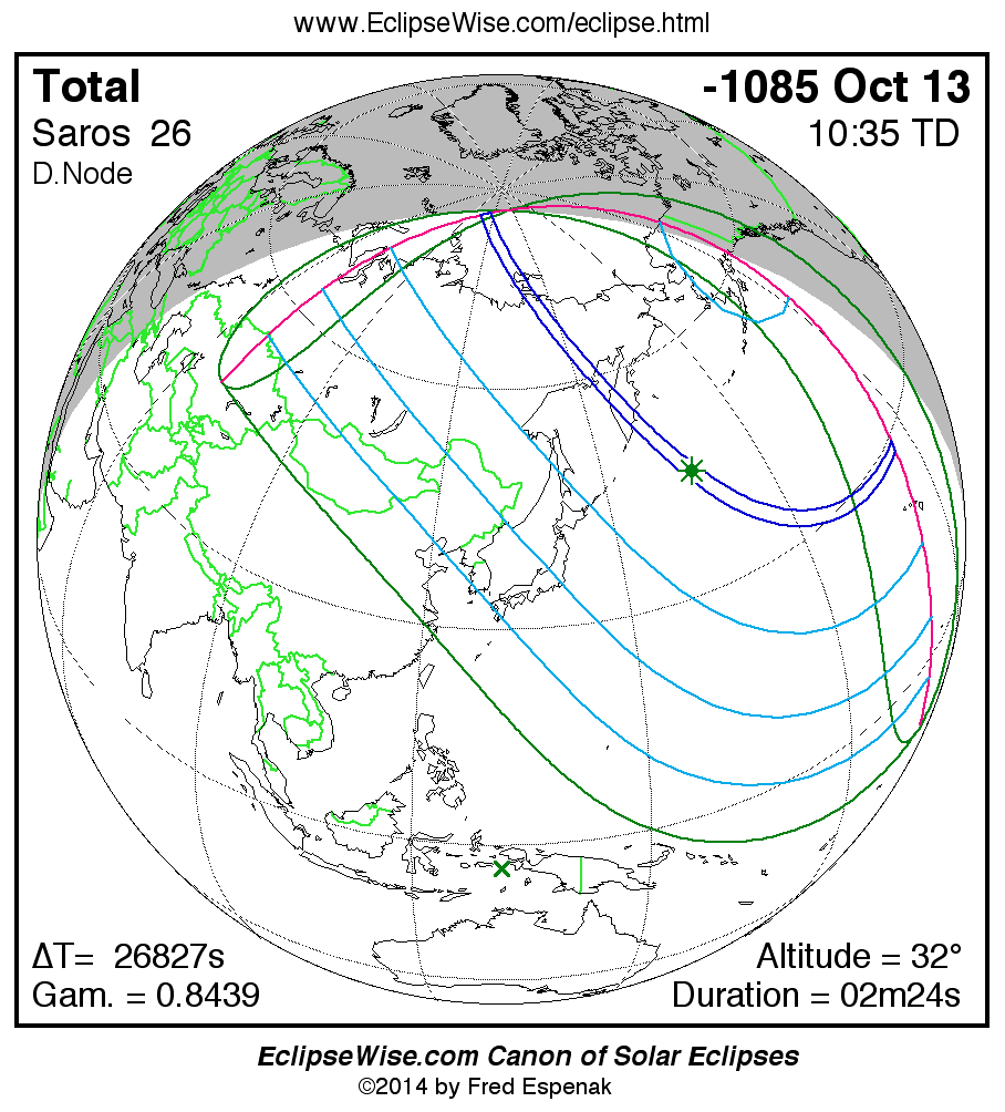 Total Solar Eclipse of -1085 Oct 13 (1086 Oct 13 BCE)